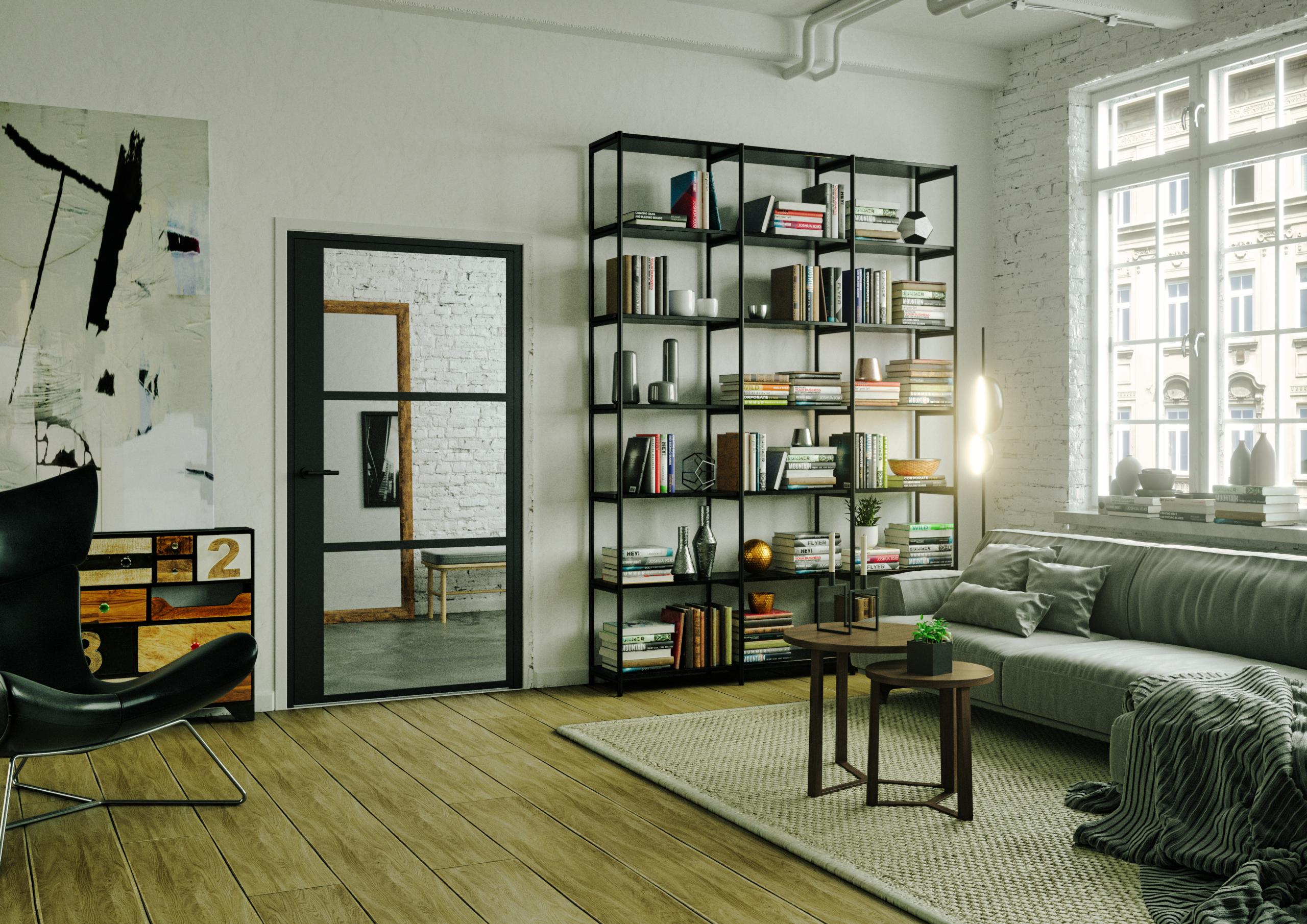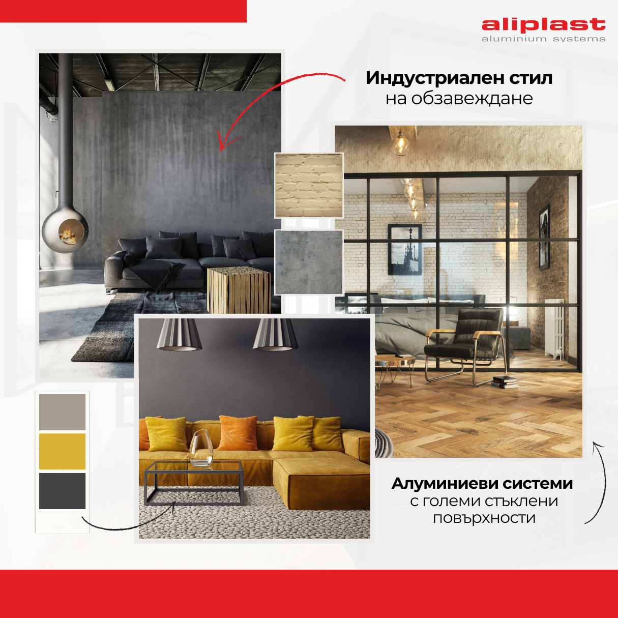 Тъй като индустриалният стил произлиза именно от отворени пространства, разделянето на отделни зони със стъклени преградни стени е част от неговата естетика. Именно затова изборът на алуминиеви профили не само че подхожда на този стил, но е и неразделна част от неговото всеобщо усещане. За подобни пространства алуминиевите дограми на Aliplast могат да бъдат изработени с големи стъклени повърхности и черни алуминиеви профили, които се съчетават с останалите елементи на дизайна.